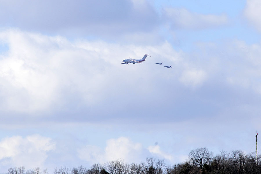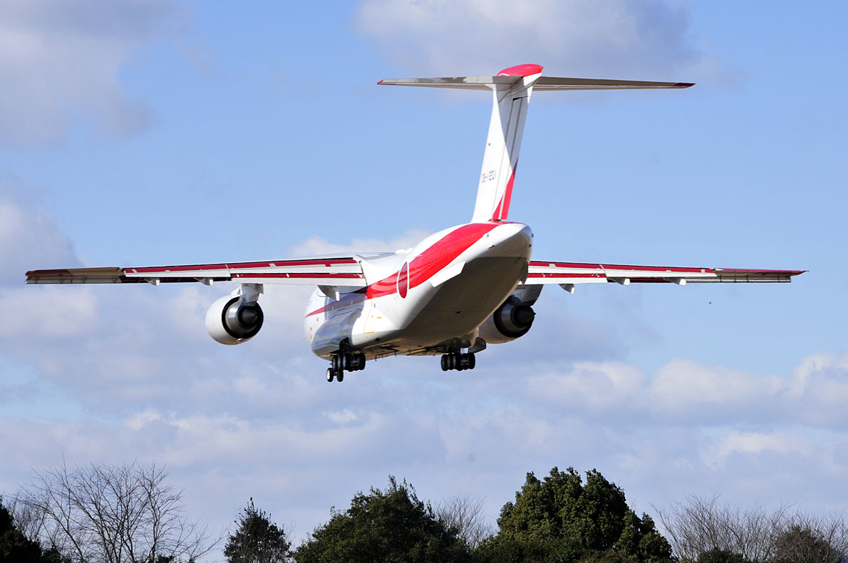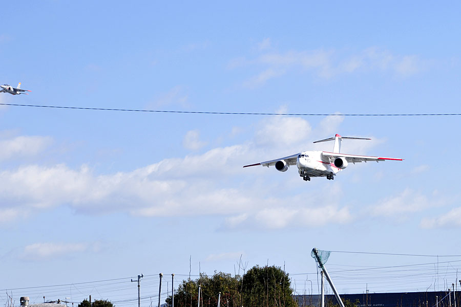T-4を率いて編隊を組むC-X輸送機。随伴のT-4が機首を上げ気味で飛んでんのは慣らしのC-Xに速度を合わせるためですかね?ぐるっと廻ってきて今度こそ着陸かな?ぐんぐん高度が下がってきます。危ない!ケーブルに引っかかる!!なワケねえだろ(声:田中裕二)