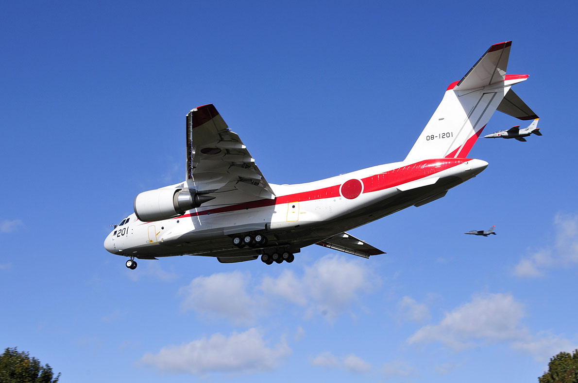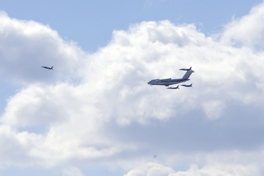 試験機の紅白の塗り分けが奇麗です。ゆっくり飛んでるように見えて、近づくと速ェですなあ。あっと云う間にさようなら。この輸送機、早ければ3年後には配備を開始するとか。それまで無事に大きく育って欲しいものです。お仕舞にT-4の写真を。撮影時は気づかなかったですが、空中勤務の兵隊さんが手を振っております。あと、記録用のムービーも持ってるみたい。ヤベぇ、面が割れちまった。なんてね└(´Д`)┘