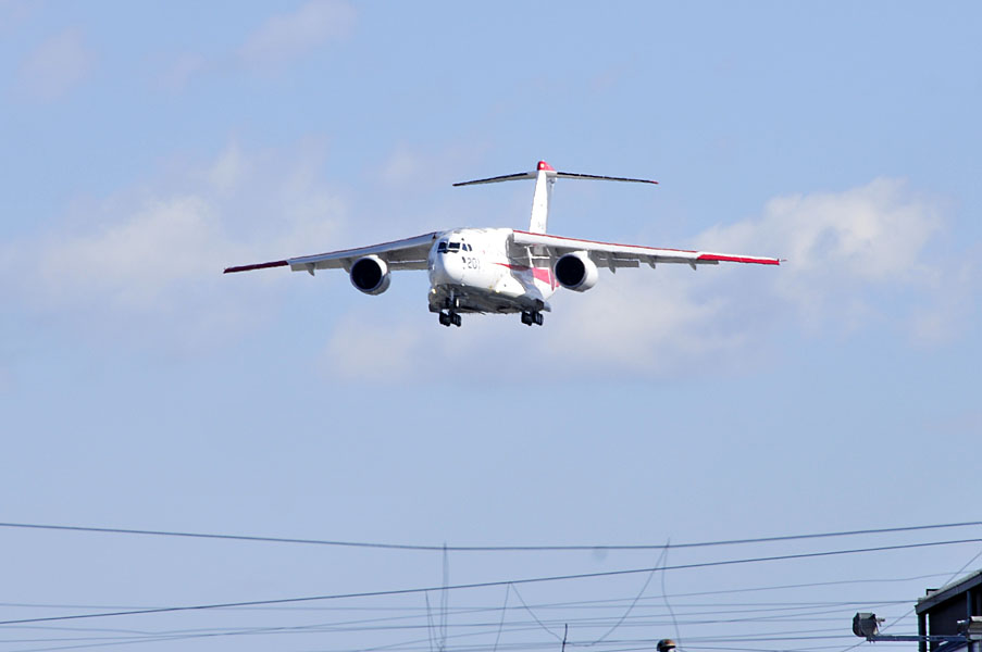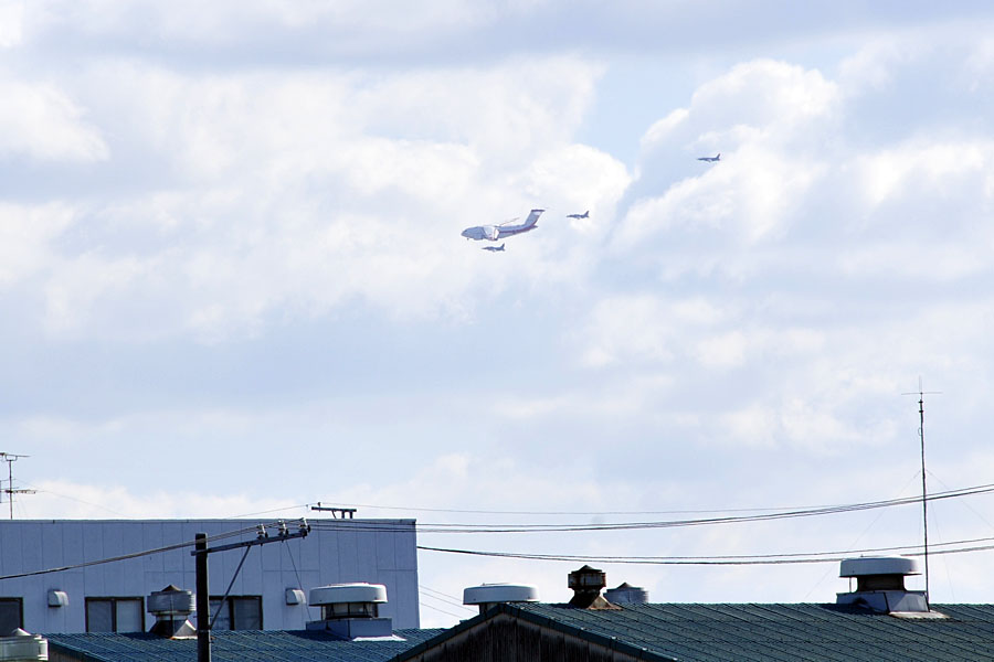 今日は新しいカメラで初の動く被写体だったんですが、なかなか難しいですなあ、3Dトラッキングが。説明書にも書いてあったんですが、色のコントラスト差で認識してるらしいんで、空+べたっと白いC-Xより暗めのT-4にフォーカスポイントが行っちゃったり、C-Xの翼端の赤い色に寄っちゃったり。持ち腐れにならないように、もう一つ勉強したいと思います。