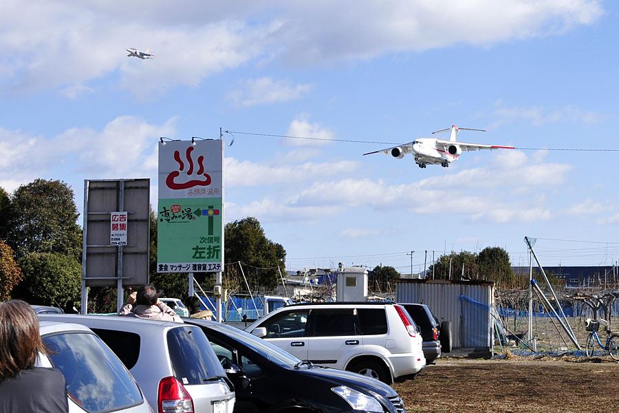 飛行場近くの撮影ポイントへの坂道を車で登ってゆくと、坂の上からいきなりC-XとT-4の編隊のお出まし。デカイ!そして運転してるから写真撮れねえ!写真を撮ってる人をパイロン代わりにジムカーナをしながら(嘘)、大急ぎで撮影準備。もうランディングしちゃったかなあ、と思ったらぐるっともう一周回ってきてくれるようで!有り難屋有り難屋。