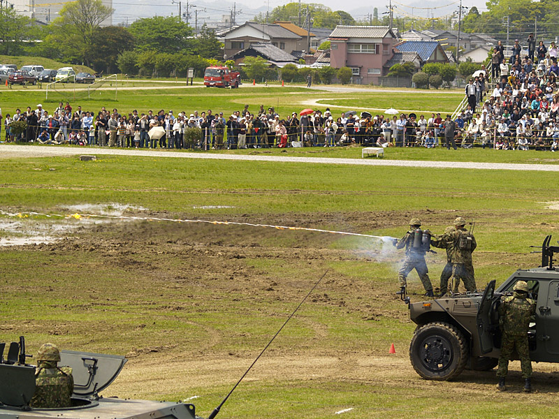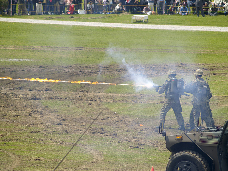 お楽しみの訓練展示ですが、今回の個人的な目玉は戦場で出くわしたくないものNo.2の火炎放射器ですかね。こいつを生で見るのは初めてです。重油まじりの燃料なんで、かなり遠くまで炎が飛びます。写真で見るとなんだかよく判らないのが残念。腕を上げなければ。余談ですが、出くわしたくないものNo.1は自走対空機関砲ですね。あれ水平発射すんの陸戦条約で禁止にしようぜ。