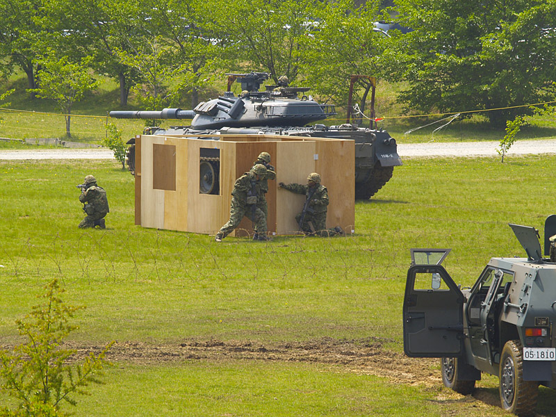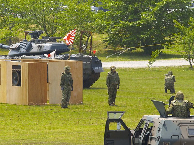 支援砲火の後、戦車が前進して突破口を作りつつ、軽装甲機動車を盾にジリジリ前進する歩兵。空砲とは云え今回はいつもより余計に発砲していた感じ。そして突入~占領であります!バンザーイ!風に閃く連隊旗~記紋は昇る朝日子よ~♪旗は飛び来る弾丸に~破るる事こそ誉れなれ~♪おいおい歌ってんの俺だけかよ。
