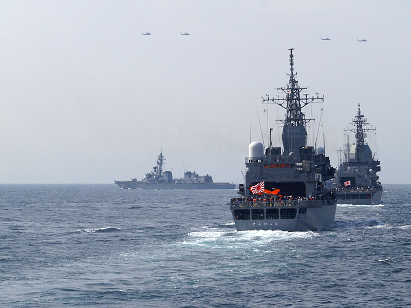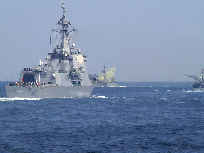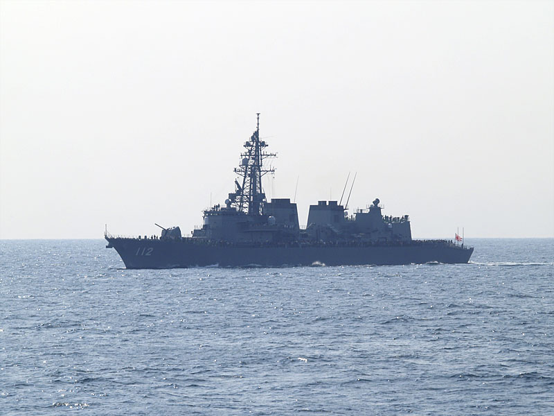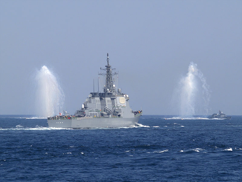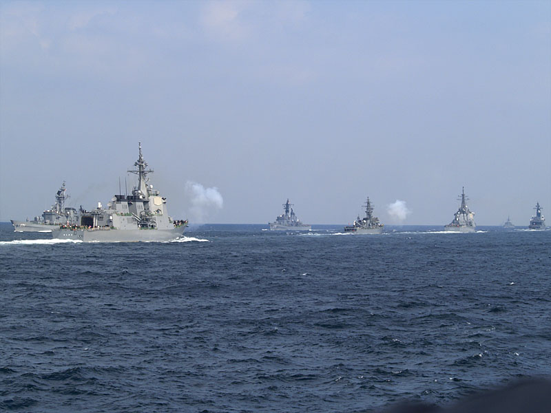 艦隊は左に回頭、いよいよ訓練展示であります。が、それまでのちょっとの間、逆光で光る海に浮かぶ艦影をぼんやり眺めてクールダウン。