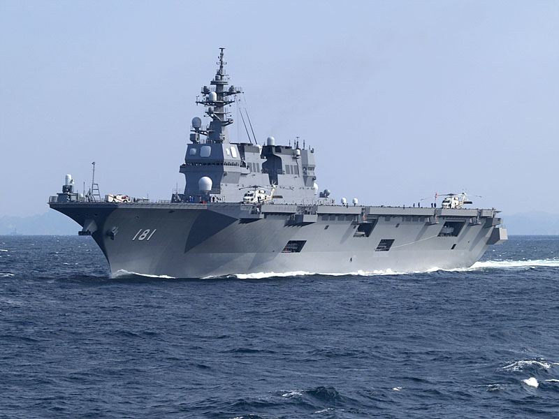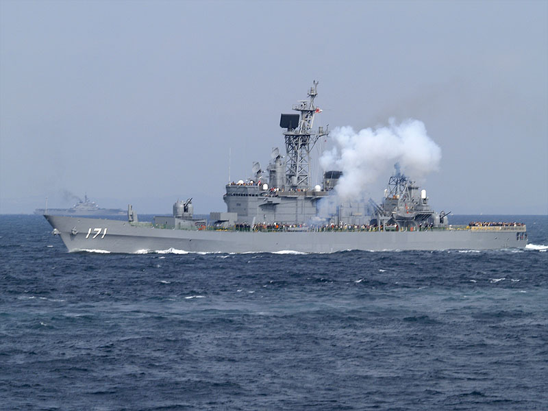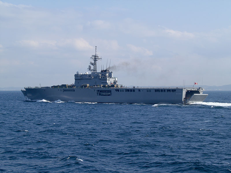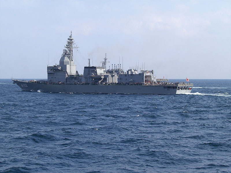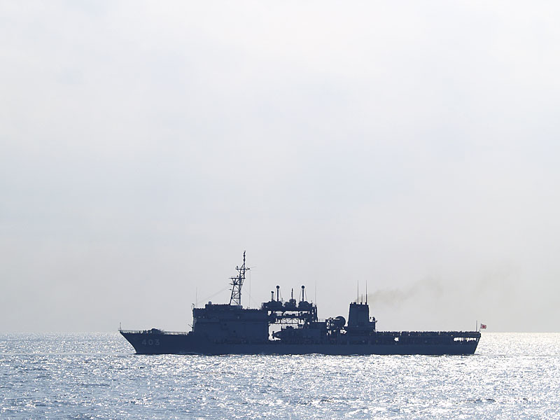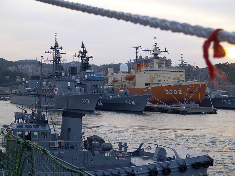 ここでこれまで紹介しきれなかった艦を。先ほどの訓練展示で対潜ロケットをブッ放したゆうばり ゆうべつ姉妹、LCACを収納した後か、漏れないギャザーが半開きのおおすみ、観閲付属部隊先導のまきなみ、同隊随伴のあすか、そして受閲艦隊第2群の新鋭艦ひゅうが。以上を紹介したところでそろそろ港へ到着、下艦であります。ここまでお付き合い有り難うございました。ちょうど時間と〜なりました~♪ってことで、この辺りでおしまい。