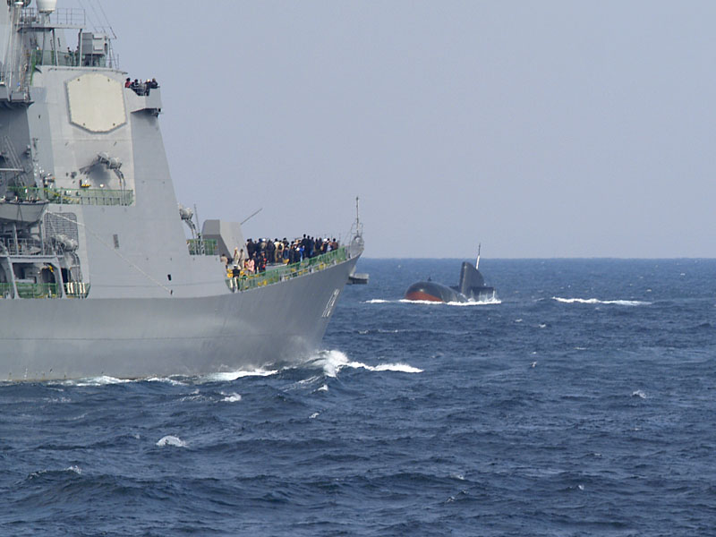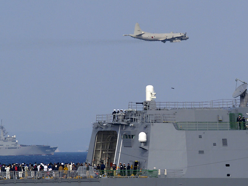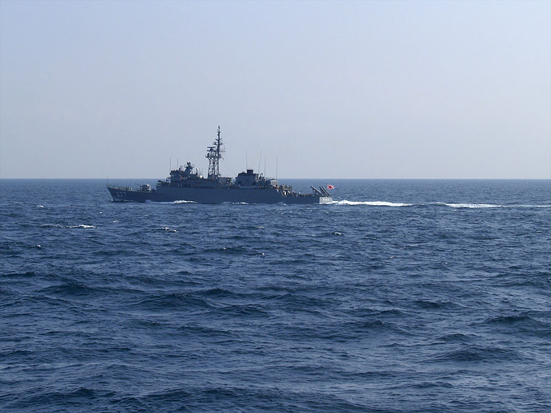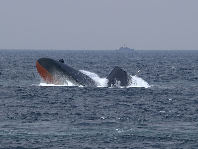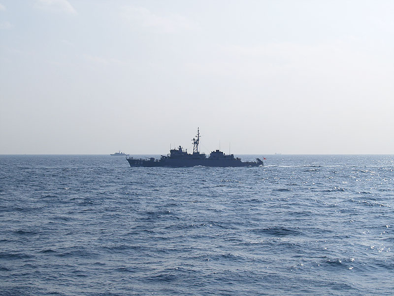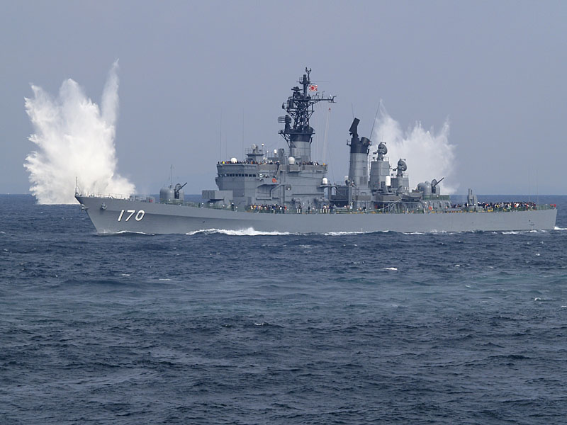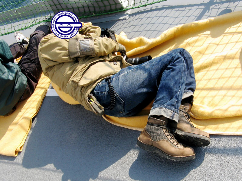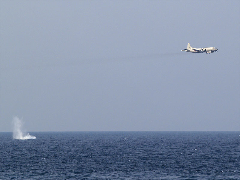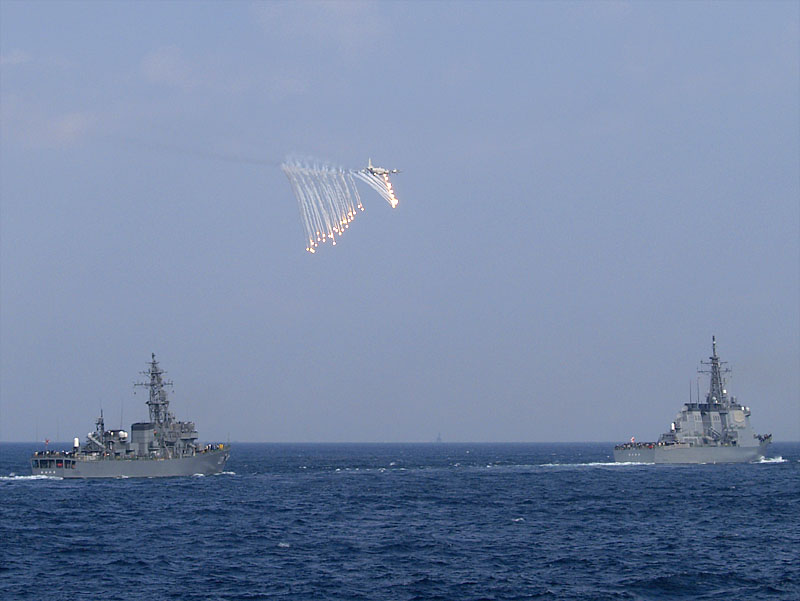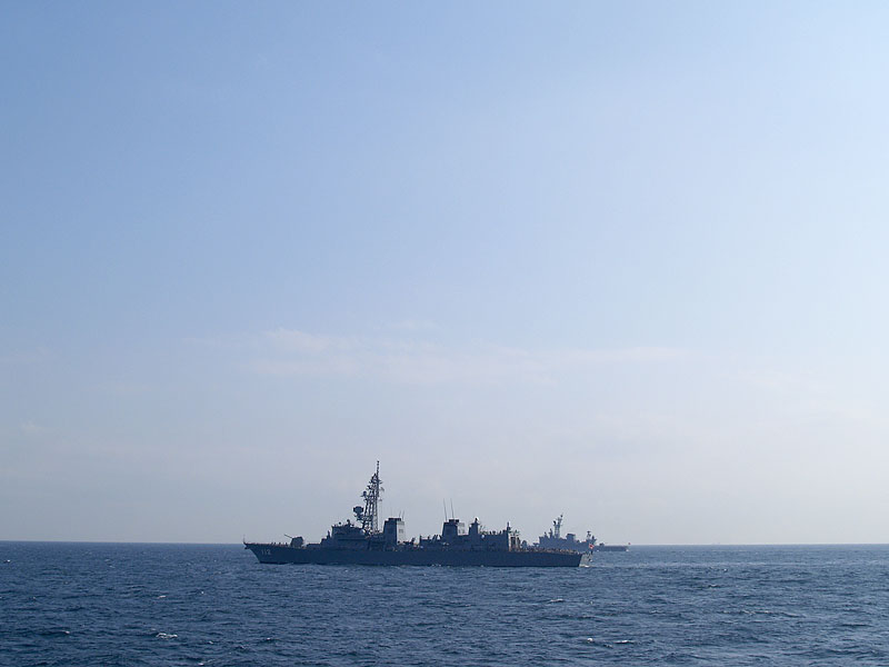 でもってP-3Cが飛来、対潜爆弾をポロリ、そしてドボンと。ここで水柱とP-3Cを同時に押さえたいワケですが、そんな引いた画は撮れません、やっすいレンズしか持ってないんで。もう一周回ってきてフレアをバラ撒いたところで訓練展示もそろそろおひらき。港へ帰るまで艦内をウロウロしたり、昼寝をしたり写真を撮ったりして過ごすのでありました。