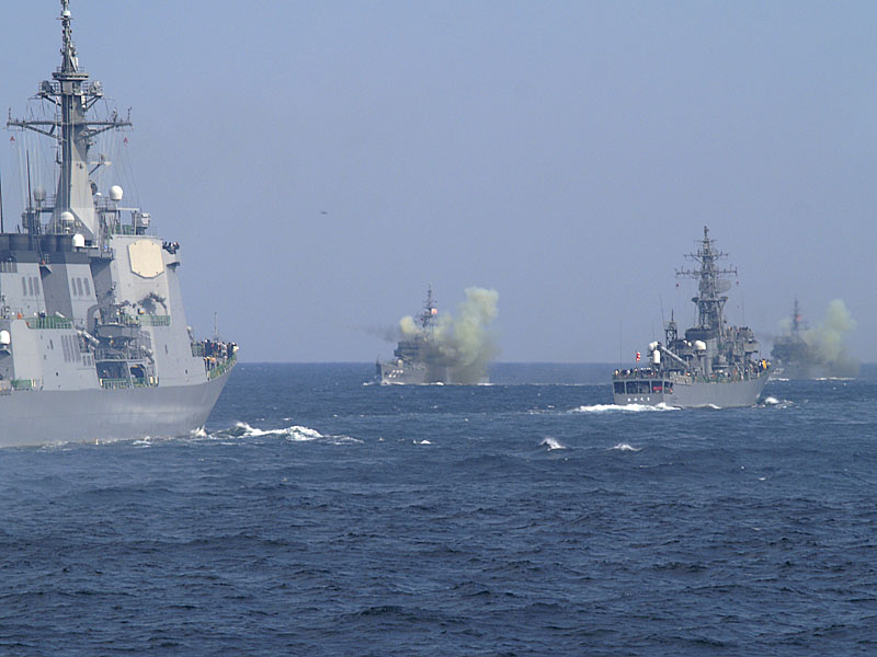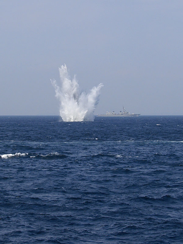 と、うすらぼんやりも束の間、砲撃が始まりました!が、如何せん音が猛烈に遅れて聞こえてくるんで、ドーンと云った頃にはこの有様。しかもピンが甘い。陸戦以上に撮影が難しいなあ。あー!さわかぜが!と、大きな水柱。こいつぁゆうばり ゆうべつから投射された対潜ロケット爆雷であります。低圧で初速がわりと遅いせいか、爆雷が写っております。決してCCDに付いた汚れではございません。