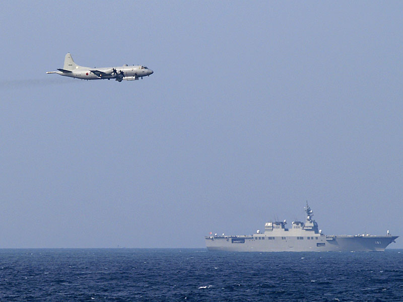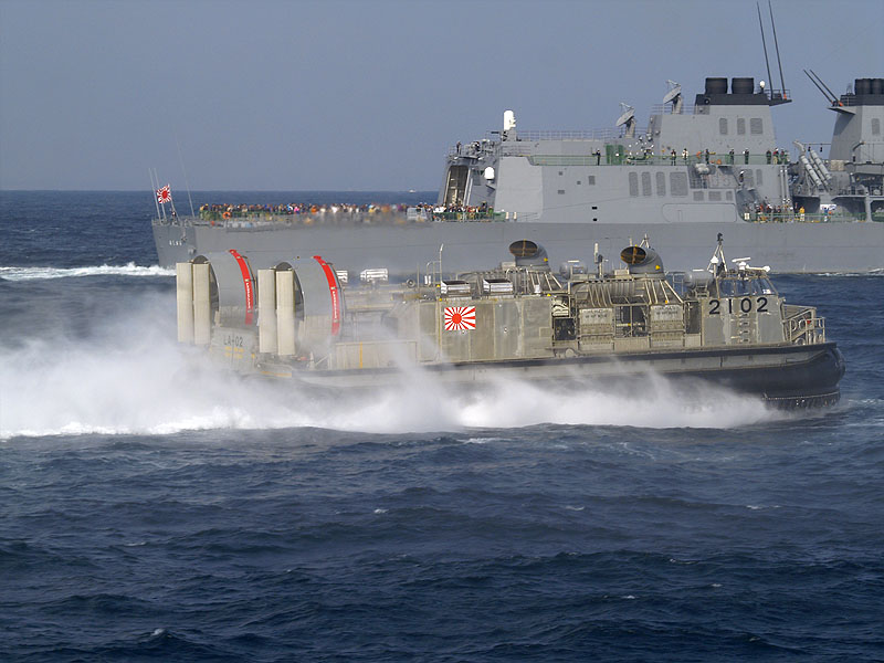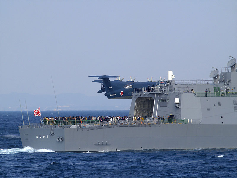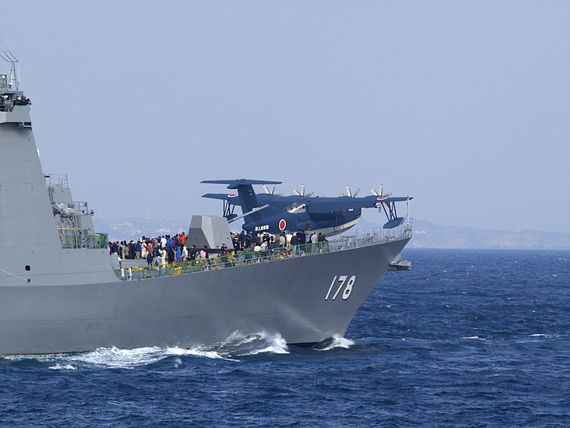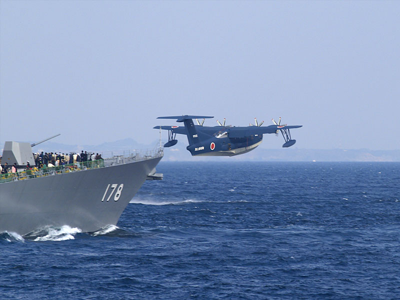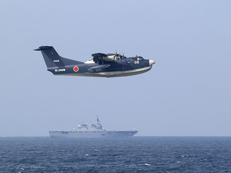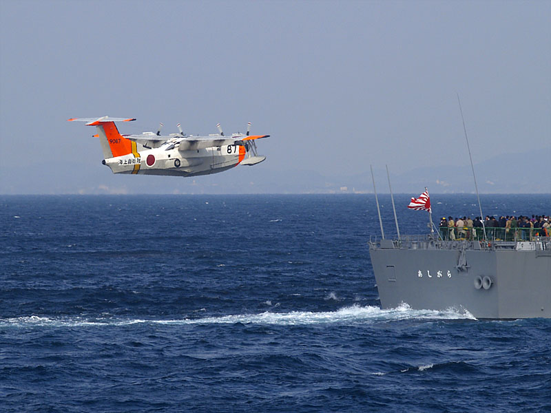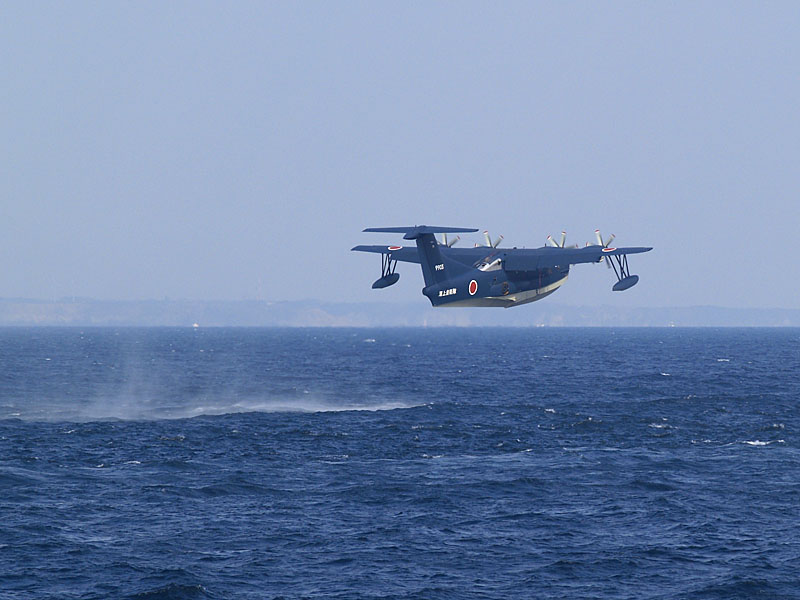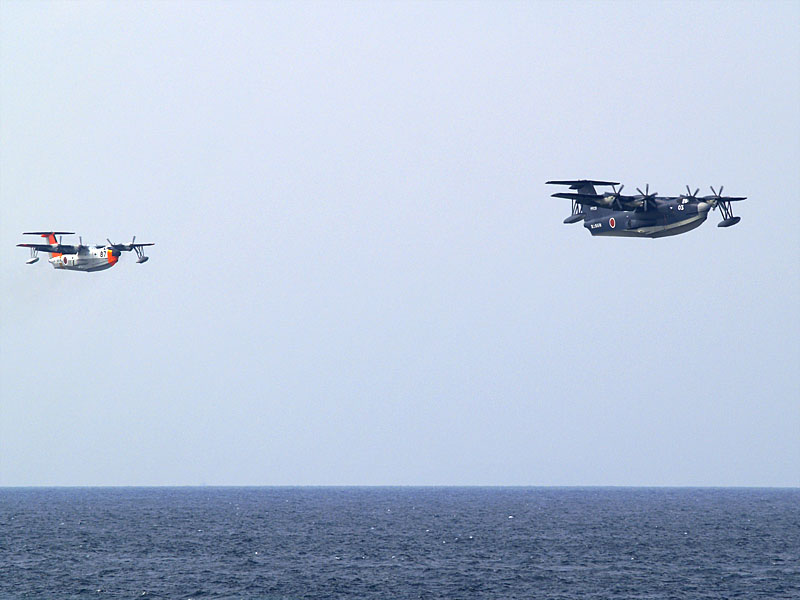 この後ミサイル艇からチャフフレアの発射があったりするんですが、艦の位置関係で良い画は無しヨ!とね。LCACとミサイル艇が追い抜いて行くと、本日2回目の登場、兵庫県出身、川西部屋改め新明和部屋所属のUS-1関とUS-2関であります。